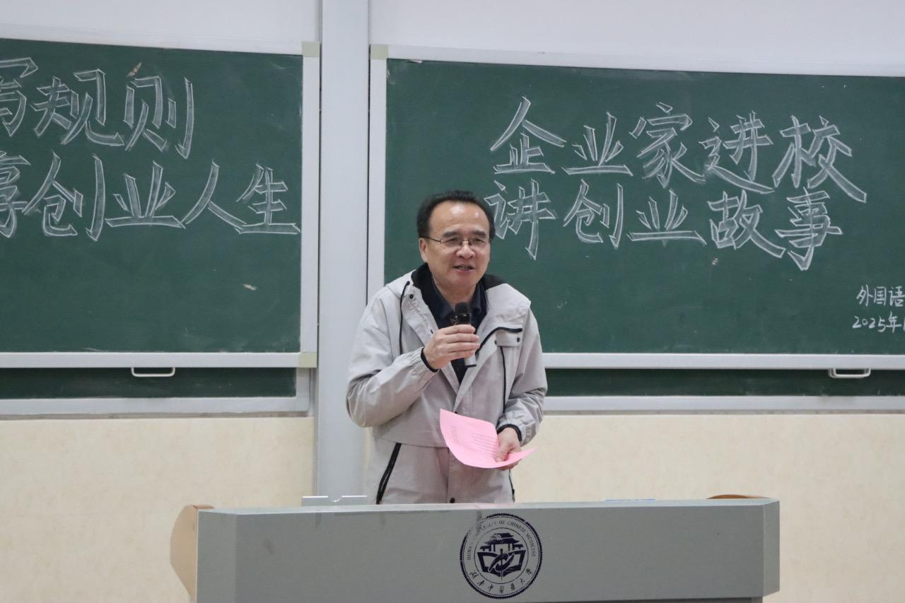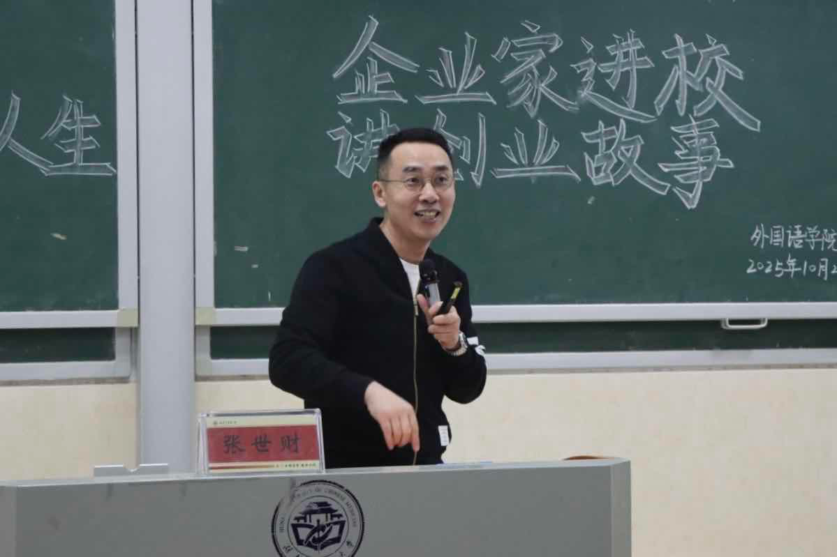 主题分享环节,张世财以“创业认知破局”为主题,结合个人创业经历,系统阐释自身创业思维与实践路径。他以自身在大学期间售卖热水器的经历为例,鼓励同学们主动汲取前辈经验,借鉴有效方法。并提醒大家意识到认知迭代的重要性,应不断通过深度研读商业经典与行业报告,更新知识体系,敏锐洞察行业趋势;应主动融入优质圈层,在交流中拓宽视野,在学习与实践的平衡中积累资源、锤炼能力;应强化创业资源的主动链接,善用商务英语的跨境沟通优势,持续深化专业认知。
