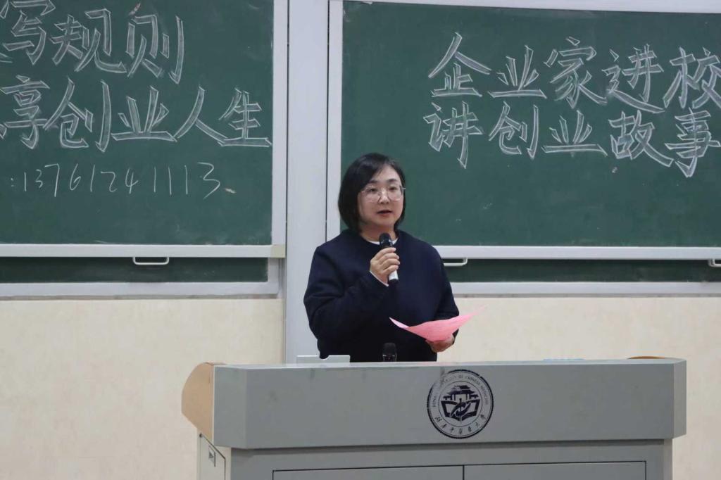 商务英语教研室主任谢粤湘作总结发言。她对张世财的经验分享表示高度认同,并以“从零开始”、“以终为始”、“以史为鉴”、“独立思考”及“创业宝典”五个关键词凝练重点,鼓励同学们将所学转化为行动,在实践中不断成长。