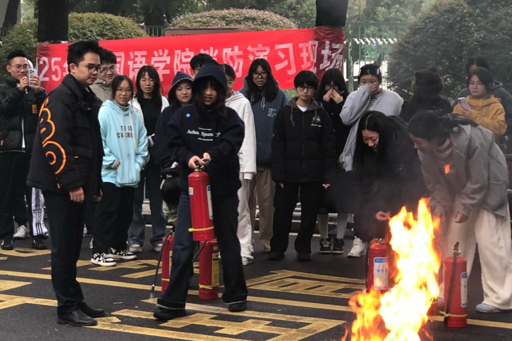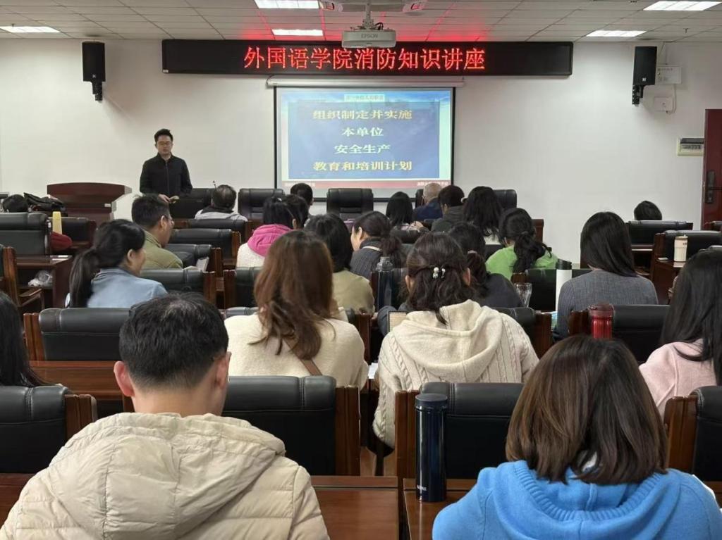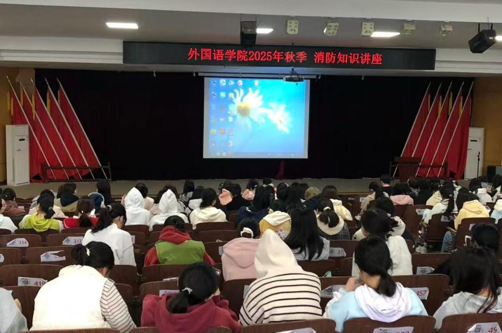 (通讯员:王芊)11月11日,我院分别于东塘校区学术报告厅、含浦校区济世楼706会议室组织开展2025年秋季师生消防知识讲座,并于东塘校区学生宿舍开展消防实践演习。外国语学院全体教职工及2025级全体同学参与此次活动。
