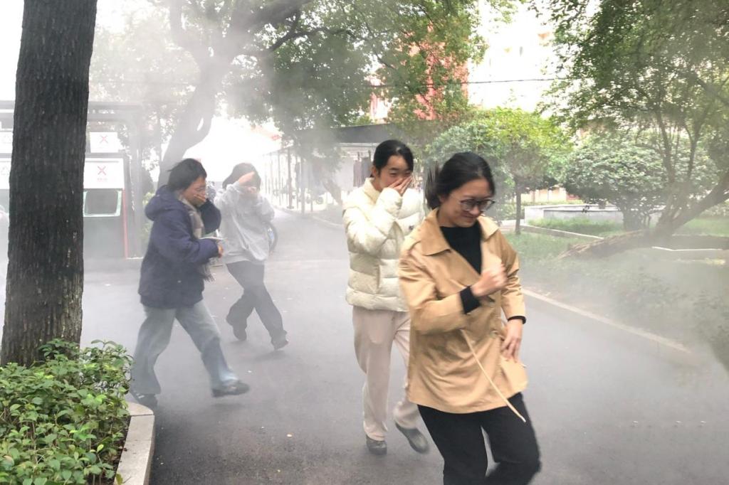 演习环节,湘安消防人员组织同学们进行疏散撤离演练和灭火器操作实践。在专业人员指导下,同学们按照“提、拔、握、压”灭火器操作四步骤,成功将模拟火源扑灭。